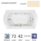 Jacuzzi SAL7242WCR4IHA Salerno 7242 Whirlpool Illuma RH Almond. Salerno Collection:For the finest in transitional bath design, JacuzziÂ's Salerno collection of luxury tubs tops the list. Wide arching curves, chamfer edges, and sculpted details help give any luxury bathroom a striking look. JacuzziÂ's Salerno luxury tub collection comes in your choice of four colors (white, black, almond, and oyster) and is available as a soaker, PureAir , Whirlpool, or Salon Spa experiences.Measurements:72"L x 42"W x 25"HLuxury Whirlpool:At its most basic form, the three things needed to create a whirlpool experience are water (moved through a pump), air (mixed with the water), and jets (Therapro and AccuPro). Jacuzzi s Comfort Whirlpool models do just this. A single speed motor and patented fixed airflow system push mixed water through 5-8 jets. Luxury models take things even further by swapping out the single-speed motor for a multi-speed motor and upgrading the airflow systems to electronically operated and patented Silent Air Induction technologies. Luxury Models tend to have double (in some cases, triple) the jets of Comfort models, enhanced user controls, and a number of optional high-tech upgrades including Whisper technology, Illumatherapy lighting, and LCD user controls. When Shopping Jacuzzi Whirlpools it is important to understand what you are looking for. For some, it is a basic model that offers invigorating bathes at an excellent price-point. For others, it is a statement-making bathroom centerpiece. Whichever it may be, we have got you covered with Jacuzzi s full line of industry-leading Whirlpool tubs. Listed below are the details for the Jacuzzi Luxury Whirlpool.Powerful Multi-Speed Motor - High/Low speeds are electronically operated from the Jacuzzi user controls.Silent Air Induction - Jacuzzi s patented