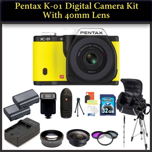 Pentax K-01 Digital Camera Kit with 40mm Lens. Package Includes: Pentax K01 with 40mm Lens(Yellow), 0.45X Wide Angle Lens, 2X Telephoto Lens, 3 Piece Filter Kit(UV-CPL-FLD), 32GB Memory CArd, 2 Extended Life Replacement Batteries and More..! You can try to find the full description and product details.