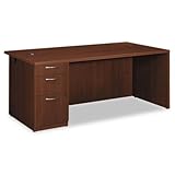 HON Park Avenue Laminate Left Pedestal Desk, 72w x 36d x 29h, Shaker CherryUpscale design with clean lines and quality craftsmanship. Easy-care laminate is spill-, scratch- and stain-resistant to stand up to daily wear and tear. Drawers operate on steel ball bearing suspensions for smooth, quiet operation. Pencil/media/file drawers; media drawer includes an organizer to hold CDs, tapes, disks and more. File drawer extends fully and includes hangrails for letter or legal size files. Recessed modesty panel with 6-1/8" conference overhang. Wire grommets for convenient cord management. Distinctive tri-oval edge detail. Satin nickel loop handles.