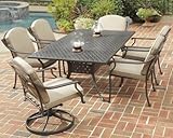 Home Styles 5564-3158 Covington 7-Piece Dining Set with Table, Cushioned Swivel and Arm Chairs, Chocolate Metallic FinishThis 7-piece dining set includes a oval dining table, two swivel base chairs, and four arm chairs. Constructed of cast aluminum with a UV resistant, powder coated chocolate metallic finish with gold flecks. The oval dining table features a top that is designed specifically to prevent damage caused from pooling by allowing water to pass through freely. Adjustable, nylon glides prevent damage to surfaces caused by movement and provide stability on uneven surfaces. Swivel base and arm chairs features a hand applied chocolate metallic powder coated finish with gold flecks is sealed with a clear coat to protect the finish, extruded aluminum frame with nylon glides on all legs. Chairs are over sized for added comfort. Cushions are constructed of woven umbrella weather resistant fabric in an antique gold fabric. Swivel seat measures 16-inch height and height from floor to the top of the arm 24-1/2-inch. Arm chair seat measures 16-inch height and height from floor to the top of the arm 25-1/4-inch. Upsable and easy to assemble. Table measures 43-inch width by 72-inch depth by 30-inch height. Chair measures 29-1/4-inch width by 25-1/4-inch depth by 36-inch height.